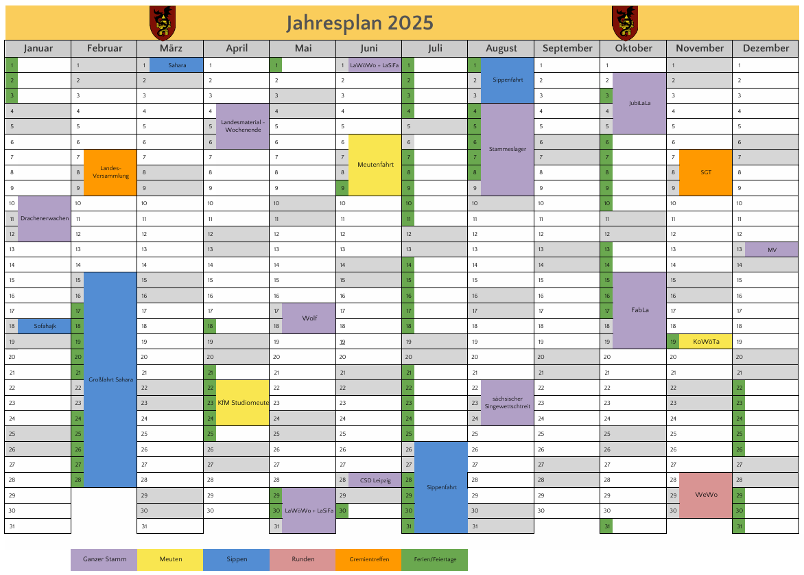 Wichtiger Hinweis: Die Gruppenstunden sind nicht im Kalender eingetragen. Die Zeiten finden sich unter Gruppen im Stamm und finden nur zu Schulwochen statt.